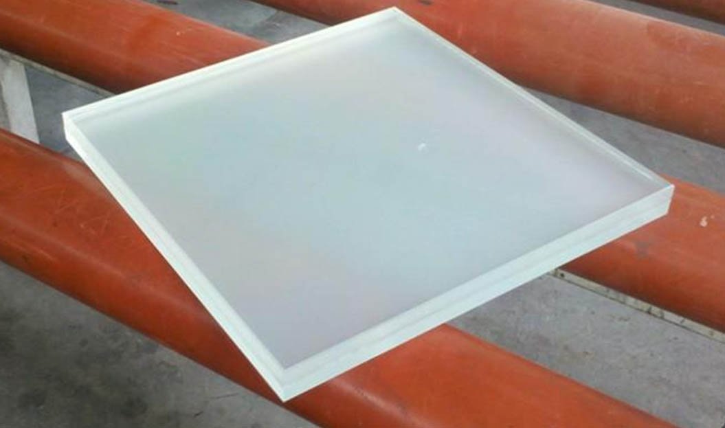El vidrio intercalado de lijado ácido está compuesto por dos o más piezas de vidrio ácido y película intermedia de polímero orgánico. La película intermedia se coloca entre dos o más piezas de vidrio, y después de un tratamiento de alta temperatura y alta presión, se adhiere a un todo para formar un vidrio laminado.