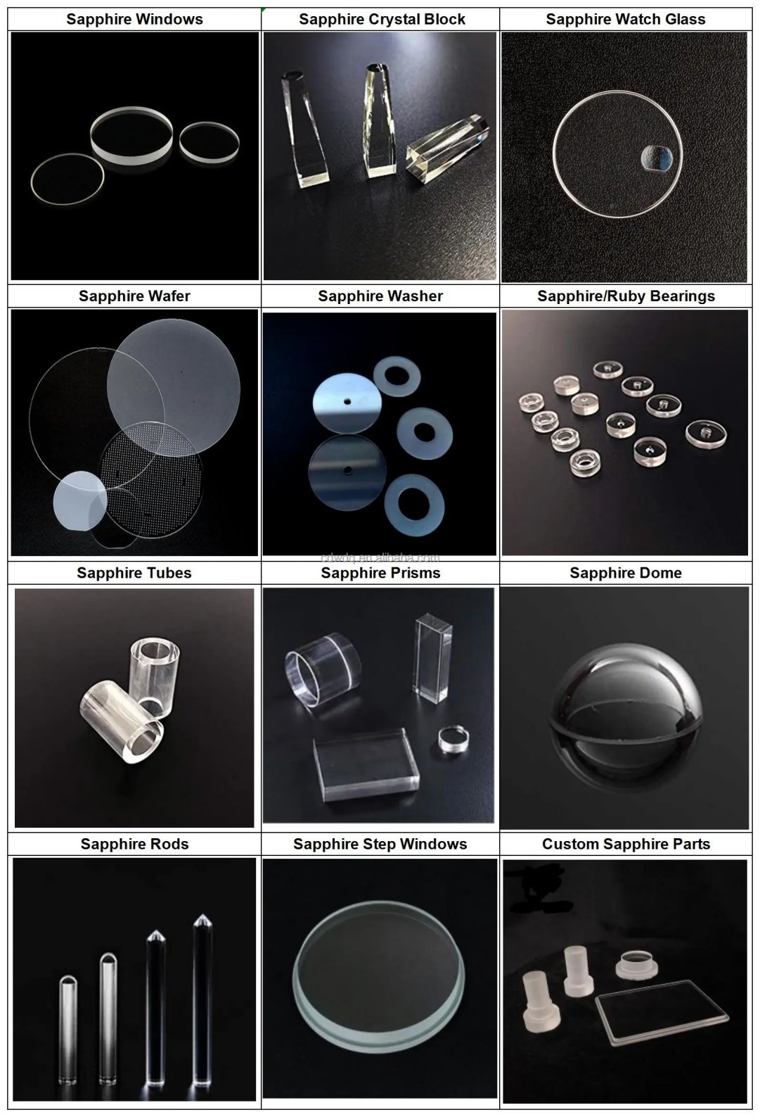 El zafiro es un óxido de aluminio monocristalino (Al2O3). Es uno de los materiales más duros. El zafiro tiene buenas características de transmisión en el espectro visible e infrarrojo cercano. Presenta alta resistencia mecánica, resistencia química, conductividad térmica y estabilidad térmica. A menudo se utiliza como material para ventanas en campos específicos, como la tecnología espacial, donde se requiere resistencia a los arañazos o a altas temperaturas.