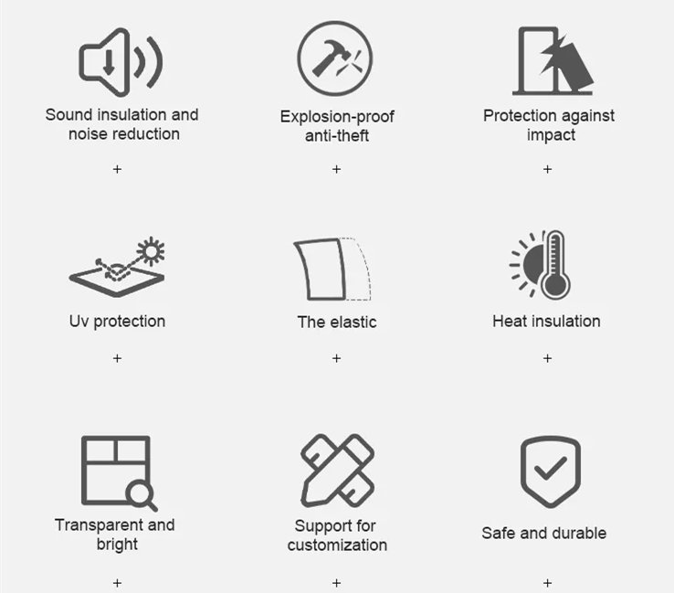 Performance advantages | Safety,Hurricane resistance, Earthquake resistance, Explosion-proof, Noise reduction, Sunlight control, UV protection,Water pressure resistance. |