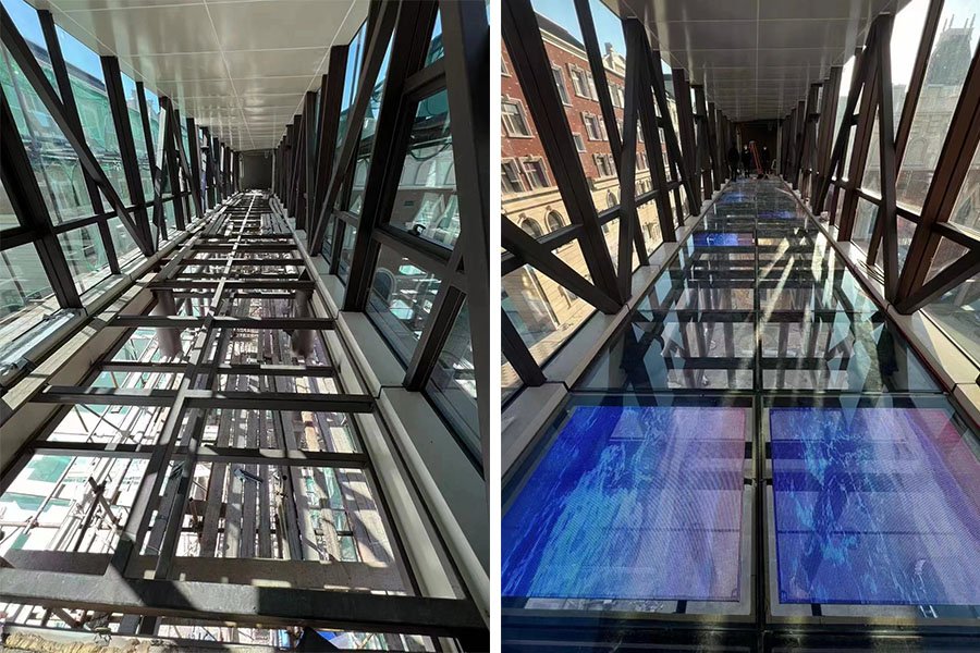 Cuando el vidrio laminado se rompe, los fragmentos de vidrio se adhieren firmemente a la película intermedia y se mantienen intactos, lo que puede llevar a cabo un tratamiento antideslizante superficial de acuerdo con las necesidades reales, adecuado para pasillos de vidrio interiores o Exteriores.